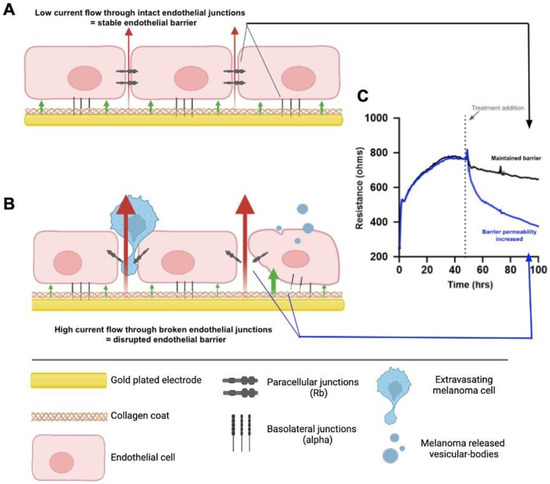 Schematic explaining ECIS theory. (A) Endothelial cells grown on the gold-plated electrodes of the ECIS plate that are coated with collagen, forming a confluent monolayer. The monolayer is formed via intercellular junctions and junctions with the collagen substrate, creating the paracellular and basolateral junctions, respectively. The formation of these junctions prevents high current flow from the electrode through the cells, where the red and green arrows represent the paracellular (Rb) and basolateral (alpha) current flow, respectively. This maintained electrical resistance is shown in graph C (Black). (B) The endothelial monolayer following treatment with factors that disrupt the endothelial barrier, such as melanoma cells or melanoma vesicular-bodies; the junctions weaken, allowing for greater current flow through the cells. This results in a decreased electrical resistance, shown in graph (C) (Blue). (C) A model ECIS graph depicting the plateau in resistance formed prior to treatment, indicating a fully formed endothelial barrier, and the corresponding results from 1. No treatment added (Black) and 2. Melanoma cell addition (Blue). Created with BioRender.com by Dayna Spurling; Reprinted/adapted with permission from Ref. [55]. 2019, Anchan, A.
