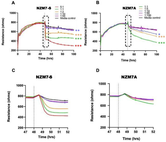 Melanoma-mediated decrease in brain endothelial barrier resistance. Graphs show unmodelled resistance (at 4000 Hz) of hCMVECs over time after the addition of the NZM7-S and NZM7A cell lines (A,B, respectively). hCMVECs were seeded at 20,000 cells per well. NZM7 cell lines were added at different Effector:Target (E:T) ratios, where 1:1 shows 1 NZM7 cell added to 1 endothelial cell. Graphs (C,D) are representative of the 4 h time period within the box of respective graphs (A,B). Data show the mean ± SD (n = 3 wells) from 1 experiment, which is representative of 3 independent experiments. The 60 h endpoints from independent experiments were compared relative to their media control using two-way ANOVA with Tukey’s range test (* p < 0.05, ** p < 0.01, *** p < 0.001).