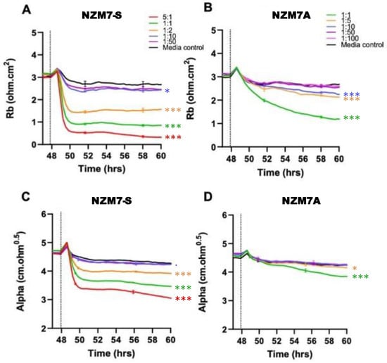 Figure 4 shows the modelled data from Figure 3, where Rb represents the barrier properties in the paracellular space, and Alpha represents the basolateral adhesion of the endothelial cells (see Figure 2 highlighting these locations and [55,58,67] for detailed explanations of ECIS modelling). It is clear that the effect of the NZM7-S material was much faster than that of the living melanoma cells (NZM7A), where loss of Rb was considerable within 1–2 h of NZM7-S addition.