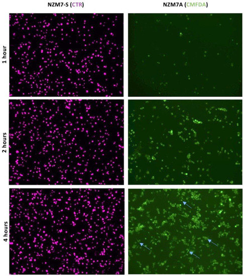 NZM7-S adhere to human cerebral microvascular endothelial cells at a faster rate than NZM7A cells. hCMVECs were seeded at 20,000 cells per well in three identical plates. NZM7-S and NZM7A cells were stained with live cell stains CTR and CMFDA, respectively. After the formation of a confluent monolayer of hCMVEC (endothelial cells) at approximately 48 h, the melanoma cells were added to the apical face of hCMVECs at an E:T ratio of 1:1. Blue arrows show evidence of NZM7A cells elongating at 4 h. The presence of the hCMVECs is not revealed in the respective images. Melanoma populations were co-cultured on top of the hCMVECs for 1, 2 and 4 h, at which time points non-adherent material was removed and cells fixed in PFA. Images were acquired at 10× on an EVOS microscope.