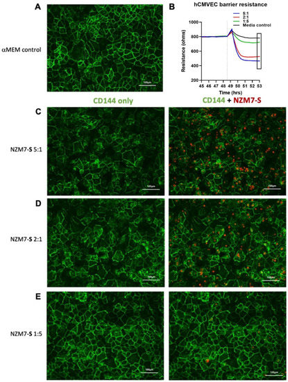 Human cerebral microvascular endothelial cell CD144 staining after NZM7-S treatment at varied concentrations. hCMVECs were seeded at 20,000 cells per well. NZM7-S were live stained with CytoTrack Red (CTR; red in image) and applied to the apical face of a confluent endothelial monolayer. Cells were co-cultured for 4 h, washed and then fixed. Junctions were stained with anti-CD144 (green). (A) An image from the media control well. (B) A paired ECIS experiment, where the boxed region shows the point of fixing for the ICC images (4 h). (C,D,E) The images of the melanoma-treated wells at different E:T ratios, noted on the left side of the panel. Images were acquired on the Operetta CLS imaging system. Full view images scale bar = 100 µm. Images are representative of 2 independent experiments.