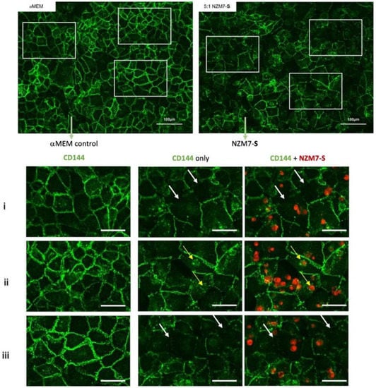 Expression of CD144 following the addition of 100,000 NZM7-S events to human cerebral microvascular endothelial cells. hCMVECs were seeded at 20,000 cells per well. After 48 h NZM7-S (red) was added in αMEM media and co-cultured for 4 h. Panels i–iii show expanded sections of the white boxes. Single left panel in i–iii shows αMEM control, and the two right panels show melanoma treated images. White arrows indicate lack of CD144 on cell borders. Yellow arrows indicate cytoplasmic expression of CD144 underneath NZM7-S. Images were acquired on the Operetta CLS imaging system. Full view images scale bar = 100 µm, cropped images scale bar = 50 µm. Images are representative of 2 independent experiments.