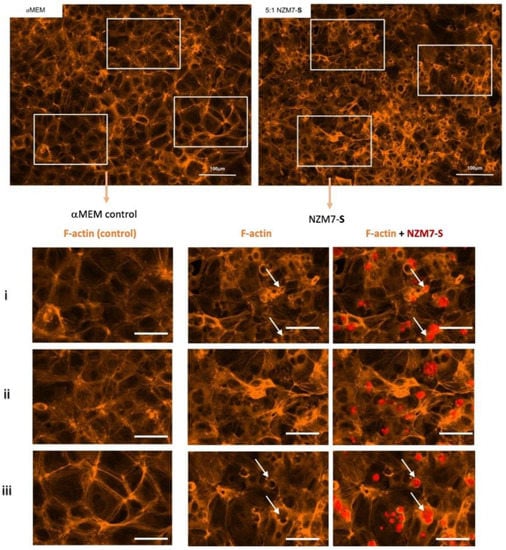 Expression of F-actin following the addition of 100,000 NZM7-S events to human cerebral microvascular endothelial cells. hCMVECs were seeded at 20,000 cells per well. After 48 h NZM7-S (red) was added in αMEM media and co-cultured for 4 h. Panels i–iii show expanded sections of the white boxes. Single left panel in i–iii shows αMEM control, and the two right panels show melanoma treated images. White arrows show ring-like F-actin structures. Full view images scale bar = 100 µm, cropped images scale bar = 50 µm. Images are representative of 2 independent experiments.