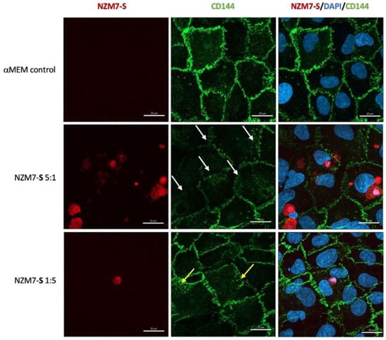 Figure 10 confirms the substantial loss of CD144 and changes to the junctional organisation, where localisation of CD144 appears to be considerably more speckled and punctate (see white and yellow arrows, respectively). This is consistent with loss of junctional integrity. Figure 11 highlights the highly disorganised F-actin structures following the addition of NZM7-S.