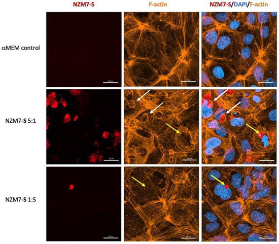 In these brain endothelial cells, typically F-actin is arranged in a highly organised fashion in close proximity to the cell membrane, close to the paracellular junctional boundary. However, following addition of the NZM7-S population, we saw a dramatic alteration in F-actin localisation. Some NZM7-S particles were clearly enveloped by actin filaments, and there was substantial re-arrangement of the F-actin from the paracellular membrane (Figure 8). This dramatic re-arrangement and removal of F-actin from supporting the cytoplasmic structure is consistent with the dramatic loss of endothelial barrier function measured by ECIS.
