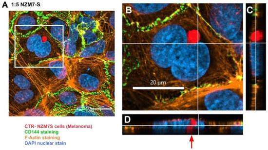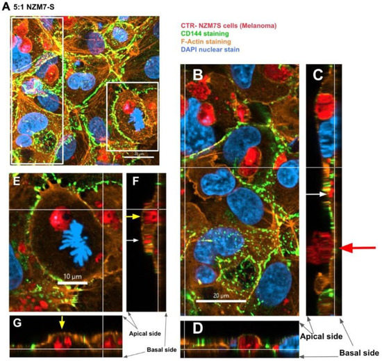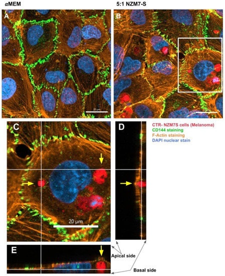 We next imaged the changes in endothelial junctional proteins, post melanoma addition. Figure 6 reveals the normal distribution of CD144 in healthy hCMVEC cells (Figure 6A) and distinct loss of CD144 localisation in the hCMVECs following addition of the NZM7-S population in an E:T ratio-dependent manner. The NZM7-S population was pre-labelled with CTR (red), and the figure shows the same images with and without the NZM7-S overlay to reveal a more global loss of CD144. These experiments were conducted in parallel with ECIS experiments, which show the barrier loss in a concordant manner. Figure 7 shows higher resolution images to reveal that the NZM7-S populations were present throughout the endothelial cells rather than positioned on the junctions. In addition, this highlights the widespread loss of CD144 (white arrows) and evidence of junctional disorganisation and co-localisation with NZM7-S, highlighted by the yellow arrows. We saw very little evidence of endothelial cell death, which implies that the NZM7-S population affects endothelial structural integrity rather than cytolysis. The scale bar in the small panels in Figure 7 is 50 µm, which gives the first glimpse of the large size of the melanoma-derived population inside the endothelial cells.