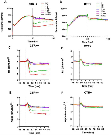 Electrical Cell-Substrate Impedance Sensing (ECIS) technology allows for real-time and label free assessment of a number of barrier-related parameters in response to changes in cellular behaviour. The impedance-based technology is able to apply a low alternating current (AC) through a confluent monolayer of cells, where the potential is then detected by ECIS technology and is used to calculate the impedance. The flow of electrons through the endothelial cell monolayer varies at different frequencies of AC and allows for the measurement of different properties of the barrier, including resistance and capacitance [62]. At low frequencies, varying between 2000 and 4000 Hz, the membrane resistance is high. High resistance results in most of the current being unable to flow through the cells and opting to take the path of least resistance, which is between the cells. At a frequency of 4000 Hz, the flow of current acts upon the intercellular space between the endothelial cells, which represents the cell–cell junctions. Therefore, at this frequency, any changes in resistance can provide information on the integrity of the endothelial barrier through the junctional spaces of the monolayer [67].