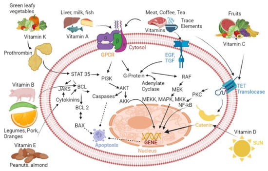 Vitamin A, or retinol, is present in animal products such as liver and eggs [11]. Carotenes, the precursors of vitamin A, are often found in plant-based foods [10,11]. For example, lycopene is a type of carotene that provides red color in tomatoes, and it is particularly important in the prevention of prostate cancer. Vitamin A is effective at reducing the risk of gliomas, lung cancer, colorectal cancer, and breast cancer [10,11]. As an antioxidant, vitamin A prevents DNA damage due to reactive oxygen species (ROS), which contributes to carcinogenesis [6,10,15]. The vitamin A metabolite retinoic acid amide inhibits the Janus kinase signal transducer and activator of transcription (JAK-STAT) pathway, which prevents lung cancer by promoting apoptosis of pre-cancerous cells [10]. A study by Hu [34], using a case–control study to recruit 256 confirmed non-small cell lung cancer (NSCLC) patients, identified the association of vitamin A precursor protein with several types of cancer. The protein known as retinol-binding protein 4 (RBP4) was found to be relatively correlated to the risk of the growth of NSCLC. RBP4 families of protein are secretory molecules that bind and transport retinol from food sources after their release into the bloodstream as well as thyroxine carrier proteins to form retinol-RBP4 ternary complex for specific physiological functions. RBP4 specifically signals pro-oncogenic pathways by stimulating retinoic acid 6, which triggers their downstream activation. Furthermore, RBP4 also mediates the onset of insulin resistance. The association between vitamins and the cadence of lung cancer was studied among 38,207 men and 41,498 women in a cohort study involving 3.98 mg and 7.80 mg retinol, respectively [2]. There was an association between retinol and the risk of lung cancer, especially for men with small cell carcinomas. Therefore, the required and recommended dose needs to be implemented in dietary guidelines if vitamin A is to reduce the risk of several types of cancer.
