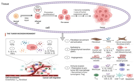 Stages of cancer and the role of inflammatory biomarkers. The tumor microenvironment (TME), comprising the fibroblasts and vascular cells as well as the inflammatory immune cells, is predominated by the macrophages after DNA damage without DNA repair with evidence of increased concentration of cytokines leading to cytokine storm. The presence of macrophages in the tumor tissue is positively correlated to the activation of cancer stages, which include cellular transformation, promotion, survival, proliferation, angiogenesis, and metastasis.