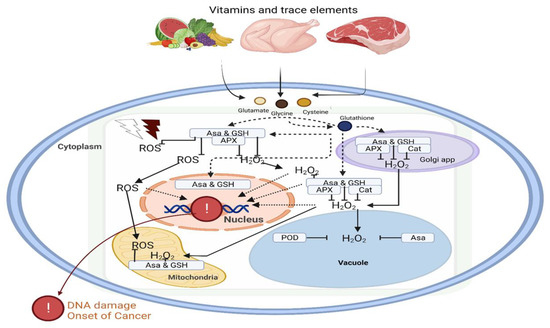 Dietary vitamins and minerals contribute to the antioxidant defense system. The impact of oxidative stress on DNA damage and initiation of carcinogenesis can be regulated by vitamins and trace elements in the different organelles of the cell. Vitamins such as ascorbic acid and reduced glutathione play a key role in oxidative homeostasis. Abbreviations: ROS, reactive oxygen species; APX, ascorbate peroxidase, H2O2, hydrogen peroxidase; POD, peroxidase; GSH, glutathione peroxidase; Asa; ascorbic acid.