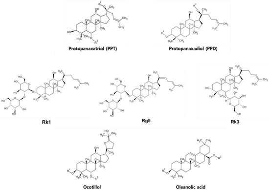 Ginseng, a herbal plant in the genus Panax, mostly found across Asia, has been used as a traditional medicine for thousands of years. Among them, Panax ginseng, also known as Korean ginseng, has significant pharmacological activities against cancer, depression, aging, fatigue, and diabetes [27,28,29,30,31,32]. Panax ginseng also has mild side effects, but has little toxicity in normal doses [33]. It consists of various chemicals, including polysaccharides, peptides, vitamins, oils, flavonoids, and ginsenosides [34,35,36,37,38,39,40,41].
