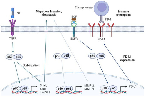 Oncogenic receptors, especially receptor tyrosine kinases such as epidermal growth factor (EGFR), proliferate the activation of protein kinase B (Akt) [164]. Akt activation triggers IKKα/β, which subsequently results in the translocation of NF-κB [165]. NF-κB is known to bind to the promoter region of the programmed death-ligand 1 (PD-L1) coding gene, inducing the overexpression of PD-L1 [166]. PD-L1 is presented to the membrane of cancer cells interacting with programmed cell death protein 1 (PD-1) in cytotoxic T lymphocytes. The interaction between PD-L1 and PD-1 interrupts the regulatory role of T lymphocytes in killing tumor cells. Notably, pro-inflammatory processes initiated by extrinsic interferon-gamma (IFN-γ) or TNF-α also facilitate the expression of PD-L1 by promoting the nuclear translocation of NF-κB subunits [167]. Therefore, agents that can inhibit the NF-κB signaling pathway may overcome the avoidance mechanism of cancer cells. Several studies have shown that tyrosine kinase inhibitors, such as gefitinib, downregulate the level of PD-L1 by modulating the NF-κB pathway.
