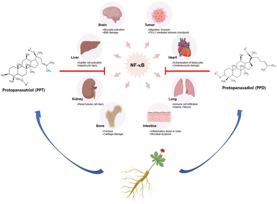 Panax ginseng is known to have various health benefits, which are applied widely, such as improving psychologic function or reducing stress and anxiety. Twenty days of 40 μM/kg of ginsenoside Rh2 administration recovered spatial and non-spatial memory in a sleep-deprivation-induced ICR mouse model by suppressing oxidative stress and antioxidant activity [53]. Additionally, a single dose of 20(S)-Ginsenoside Rg3 with different concentrations showed that 20(S)-Rg3 had concentration-dependent effects on enhancing glucose-induced insulin levels in both HIT-T15 cells and ICR mice [54]. Another study demonstrated that neuroprotective effects of Rh1 and Rg2 (10 μM and 20 μM treated groups) were shown through regulating 6-OHDA-induced ERK1/2 phosphorylation on neuronal cells (SH-SY5Y and PC-12) [55]. Among this range of effects, various studies have paid attention to ginsenosides since it has been revealed that ginsenosides are the active compounds responsible for the anticancer and immunomodulatory effects of P. ginseng [30,56,57,58,59]; however, although there is growing interest in the anti-inflammatory effect of ginsenosides, their role in modulating the NF-κB pathway remains poorly understood.