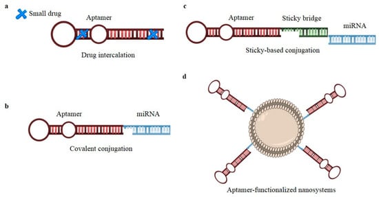 - Esposito, C.; Cerchia, L.; Catuogno, S.; De Vita, G.; Dassie, J.P.; Santamaria, G.; Swiderski, P.; Condorelli, G.; Giangrande, P.H.; de Franciscis, V. Multifunctional Aptamer-miRNA Conjugates for Targeted Cancer Therapy. Mol. Ther. 2014, 22, 1151–1163. [Google Scholar] [CrossRef] [PubMed]
