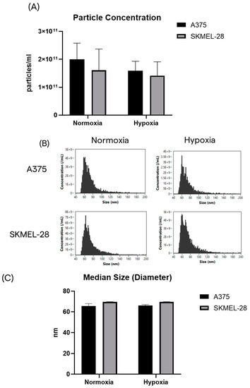 In the present study, we investigated how hypoxia influenced the release of sEVs in melanoma and focused on the characterization of sEVs from two representative in vitro melanoma cell lines, which were selected based on the study of Rossi et al. [48]. A375 cells are associated with a highly aggressive phenotype with high migratory capability and invasiveness, while SK-MEL-28 cells have an intermediate phenotype [53]. Both cell lines expressed bona fide markers of hypoxia, HIF1α, and CA-IX when grown under low oxygen conditions. Conditioned media from these cell cultures contained small extracellular vesicles (sEVs), but their concentration, median size, and size distribution did not change significantly during hypoxia. These results are not consistent with other reports indicating hypoxia as one of the factors that may increase the production and/or release of sEVs [54,55] and corroborate the idea that these mechanism are highly cell-specific.