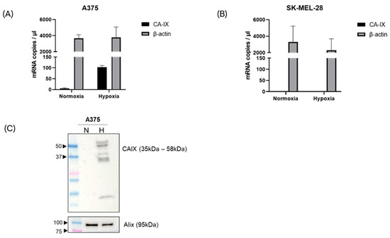 CA-IX mRNA expression in melanoma-derived sEVs, released under normoxic and hypoxic conditions. After RNA isolation, CA-IX and beta actin mRNA copies were measured by ddPCR in the A375 model (A) and SK-MEL-28 model (B). (C) CA-IX protein expression was induced in A375-derived sEVs released under hypoxia. Alix blot was used to confirm the EV identity.
