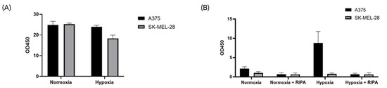 Hypoxia, described as low pO2 tension, characterizes the tumor microenvironment and is associated with an increased ability of invasion and metastatic potential in primary melanoma [22,23]. In addition, melanoma metastasis is not vascularized in the early state and adapt to the initial hypoxic condition, which can lead to an even more aggressive phenotype [24,25,26,27]. Hypoxia activates hypoxia-inducible factor-1 (HIF-1), which promotes the transcription of several genes involved in biological mechanisms related to melanoma progression such as angiogenesis, cell proliferation, and metastasis [28,29].