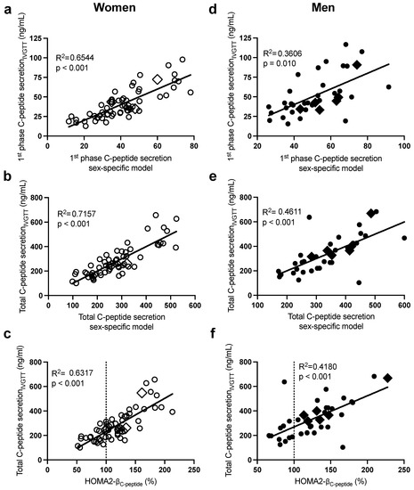 Pearson correlations between the sex-specific models, with their corresponding data for first-phase C-peptide secretionIVGTT in women (a) and men (d) and total C-peptide secretionIVGTT in women (b) and men (e), and between HOMA2-βC-peptide with total C-peptide secretionIVGTT in women (c) and men (f). Women are in open circles (N = 61, those with BMI > 40 kg/m2 are in open diamonds) and men are in closed circles (N = 37, those with BMI > 40 kg/m2 are in closed diamonds).
