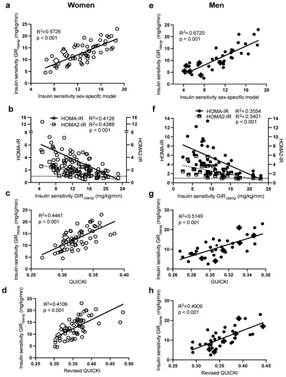 As presented in Figure 3, there was also a large intersubject variability in IS in both sexes. Notably, subjects with morbid obesity (BMI > 40 kg/m2, in diamond symbols) were also distributed evenly along the range of IS in each sex. Regression analysis (Table 2) revealed that plasma insulin followed by waist circumference were the primary predictors of intersubject variability in IS (GIRclamp) in both women (R2 = 0.52) and men (R2 = 0.57). The incorporation of plasma HDL-C in women (total R2 = 0.57) and glucose in men (total R2 = 0.67) further increased the prediction power of the sex-specific models. The sex-specific models in women (Figure 3a, R2 = 0.57) and men (Figure 3e R2 = 0.67) predicted IS (GIRclamp) better than HOMA-IR (R2: women = 0.41 and men = 0.36) and HOMA2-IR (R2: women = 0.44 and men = 0.34) (Figure 3b,f), QUICKI (R2: women = 0.44 and men = 0.51, Figure 3c,g), and revised QUICKI (R2: women = 0.42 and men = 0.49, Figure 3d,h).