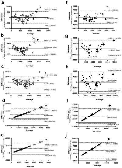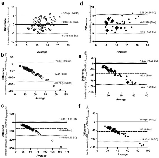 On the contrary, the HOMA2-S models, using either insulin or C-peptide, underestimated IS for subjects with lower IS (or higher IR) and overestimated it for subjects with higher IS (Figure 4c and Figure 6b for women and Figure 6e,f for men). Data generated using the HOMA models were within the 95% limits of agreement with the Botnia measures except for total GIISIVGTT in women (5 out of 61 observations) and IS using C-peptide in men (3 out of 37 observations). Notably, however, the large biases (i.e., average difference between the Botnia-clamp measures and HOMA indices) are related to different scales used for the two measures, which was up to about 10-fold higher with the Botnia-clamp measures. Moreover, Bland–Altman plots for QUICKI and QUICKI-FFA were similar to the HOMA2-S plots but in the reverse direction.