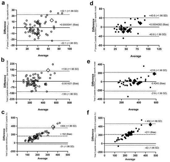 Bland–Altman plots with 95% confidence interval for limits of agreement of the sex-specific models, with their corresponding data for first-phase C-peptide secretionIVGTT in women (a) and men (d) and total C-peptide secretionIVGTT in women (b) and men (e), and between HOMA2-βC-peptide, with total C-peptide secretionIVGTT in women (c) and men (f). Women are in open circles (N = 61, those with BMI > 40 kg/m2 are in open diamonds) and men are in closed circles (N = 37, those with BMI > 40 kg/m2 are in closed diamonds).