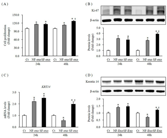 Moreover, mRNA expression and protein levels of keratin 14 (KRT14), a proliferation marker for keratinocytes [28], increased significantly at 24 h (mRNA expression increased by 2.2- and 2.5-fold at 24 h in response to 100 μg/mL NF- and HTSF-exosomes, respectively; protein levels increased by 1.39- and 1.45-fold at 24 h in response to 100 μg/mL NF- and HTSF-exosomes, respectively; p < 0.05). However, the mRNA and protein expression levels of KRT14 decreased remarkably at 48 h with NF-exosome treatment but increased at 48 h when treated with HTSF-exosomes (mRNA expression decreased by 0.56- and increased by 1.98-fold at 48 h in response to 100 μg/mL NF- and HTSF-exosomes, respectively; protein levels decreased by 0.7-fold and increased by 1.21-fold at 48 h in response to 100 μg/mL NF- and HTSF-exosomes, respectively; p < 0.05) (Figure 2C,D; Figure S2). These results indicate HTSF-exosomes may show a more pronounced effect in NHK proliferation than NF-exosomes.