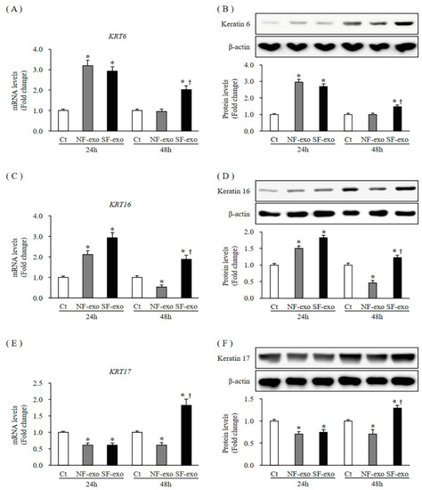 Expression of activation markers in NHKs after NF- and HTSF-exosome treatment. The mRNA and protein expression of keratin 6 (KRT6; A,B) in NHKs increased significantly at 24 h. However, these levels were unchanged at 48 h after treatment with 100 μg/mL NF-exosomes but increased in NHKs when treated with HTSF-exosomes compared with that in the control cells. The mRNA and protein expression of KRT16 (C,D) increased at 24 h and decreased at 48 h after treatment with 100 μg/mL NF-exosomes but increased when treated with HTSF-exosomes. The mRNA and protein levels of KRT17 (E,F) in NHKs decreased at 24 h after treatment with NF- and HTSF-exosomes. The mRNA and protein levels of KRT17 decreased and increased at 48 h after treatment with NF- and HTSF-exosomes, respectively, compared with those in control cells. * p < 0.05 for NF- or HTSF-exosome-treated cells versus the corresponding matched control cells. † p < 0.05 for HTSF-exosome-treated cells versus NF-exosome-treated cells. Data represent the mean ± SD; n = 4. Ct, DPBS-treated control cells; NHK, normal human keratinocytes; NF, normal tissue-derived fibroblast; HTSF, hypertrophic scar tissue-derived fibroblasts.