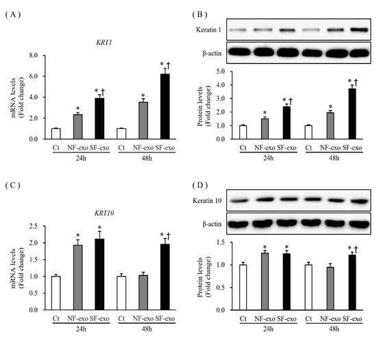 KRT1 and KRT10 are early differentiation markers of keratinocytes [28]. The mRNA and protein expression of KRT1 increased significantly at 24 and 48 h after treatment with NF- and HTSF-exosomes, respectively, compared with that in DPBS-treated control cells. Moreover, compared with NF-exosome treatment, mRNA and protein expression of KRT1 significantly increased at 48 h after HTSF-exosome treatment (compared with that in the DPBS-treated control cells; mRNA expression increased by 2.33- and 3.89-fold at 24 h and 3.52- and 6.21-fold at 48 h after treatment with 100 μg/mL NF- and HTSF-exosomes, respectively; protein levels increased by 1.50- and 2.39-fold at 24 h and 1.94- and 3.71-fold at 48 h in response to 100 μg/mL NF- and HTSF-exosomes, respectively; p < 0.05) (Figure 4A,B; Figure S4). The mRNA and protein expression of KRT10 increased at 24 h and was unchanged at 48 h after treatment with NF-exosomes, compared with that in the DPBS-treated cells, but significantly increased at 24 h and 48 h after treatment with HTSF-exosomes, compared with that in the DPBS-treated cells (mRNA expression was 1.93- and 2.11-fold at 24 h and 1.03- and 1.96-fold at 48 h; protein levels were 1.25- and 1.24-fold at 24 h and 0.94- and 1.21-fold at 48 h in response to 100 μg/mL NF- and HTSF-exosomes, respectively; p < 0.05) (Figure 4C,D; Figure S4). These results suggest that HTSF-exosomes substantially induced the differentiation of NHKs more than NF-exosomes.