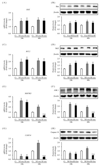 Keratinocyte apoptosis is closely involved in epidermal development; the expression of apoptotic factors also reflects the state of cellular proliferation and differentiation, including Bax, Bcl2, apoptosis signal-regulating kinase 1 (ASK1), and Notch 1 [28]. The mRNA expression and protein levels of the pro-apoptotic factor, Bax (BAX), increased significantly at 24 and 48 h after NF- and HTSF-exosome treatment, respectively (mRNA levels increased by 1.79- and 1.85-fold at 24 h and 1.96- and 1.85-fold at 48 h after treatment with 100 μg/mL NF- and HTSF-exosomes, respectively; protein levels increased by 1.2- and 1.34-fold at 24 h and 1.41- and 1.28-fold at 48 h after treatment with 100 μg/mL NF- and HTSF-exosomes, respectively; p < 0.05) (Figure 5A,B; Figure S5). The expression of the anti-apoptotic factor, Bcl2, at the mRNA and protein levels increased significantly at 24 and 48 h (mRNA expression increased by 1.95- and 2.27-fold at 24 h and 2.13- and 2.03-fold at 48 h after treatment with 100 μg/mL NF- and HTSF-exosomes, respectively; protein levels increased by 1.53- and 1.86-fold at 24 h and 1.41- and 1.28-fold at 48 h after treatment with 100 μg/mL NF- and HTSF-exosomes, respectively; p < 0.05) (Figure 5C,D; Figure S5). The mRNA and protein expression of ASK1 (MAP3K5) increased significantly at 24 h (mRNA levels increased by 3.2- and 2.93-fold after treatment with 100 μg/mL NF- and HTSF-exosomes, respectively; protein levels increased by 2.36- and 2.12-fold after treatment with 100 μg/mL NF- and HTSF-exosomes, respectively; p < 0.05) (Figure 5E,F; Figure S5). The mRNA and protein expression of ASK1 (MAP3K5) increased at 48 h after treatment with NF-exosomes, but decreased with HTSF-exosome treatment at 48 h (mRNA levels were 2.02- and 0.36-fold and protein levels were 1.83- and 0.71-fold in response to 100 μg/mL NF- and HTSF-exosomes, respectively) (Figure 5E,F; Figure S5). The mRNA and protein expression of caspase 14 (CASP 14) decreased significantly at 24 h after treatment with NF- or HTSF-exosomes, compared with that in the control cells (mRNA expression decreased by 0.36- and 0.33-fold after treatment with 100 μg/mL NF- and HTSF-exosomes, respectively; protein expression decreased by 0.69- and 0.65-fold after treatment with 100 μg/mL NF- and HTSF-exosomes, respectively; p < 0.05) (Figure 5G,H; Figure S5). Furthermore, mRNA and protein expression of CASP 14 at 48 h increased after NF-exosome treatment, but decreased with HTSF-exosome treatment (mRNA levels were 1.96- and 0.29-fold after treatment with 100 μg/mL NF- and HTSF-exosomes, respectively; protein levels were 1.29- and 0.46-fold in response to 100 μg/mL NF- and HTSF-exosomes, respectively; p < 0.05) (Figure 5G,H; Figure S5). These results further suggest that NF- or HTSF-exosome treatment regulates the expression of apoptosis-related factors in NHKs.