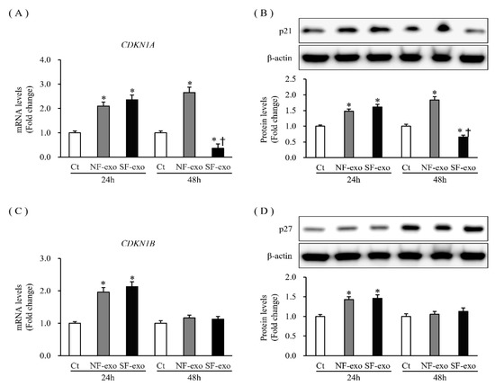 Expression of cyclin-dependent kinase inhibitors in NHKs after NF- or HTSF-exosome treatment. The mRNA and protein expression of p21 (CDKN1A) (A,B) in NHKs increased significantly at 24 and 48 h after treatment with 100 μg/mL NF- or HTSF-exosome treatment but decreased with HTSF-exosome treatment at 48 h compared with that in the control cells. The mRNA and protein expression of p27 (CDKN1B) (C,D) in NHKs increased significantly at 24 h and was unchanged at 48 h after treatment with 100 μg/mL NF- or HTSF-exosomes, respectively, compared with that in the control cells. * p < 0.05 for NF- or HTSF-exosome-treated cells versus the corresponding matched control cells. † p < 0.05 for HTSF-exosome-treated cells versus NF-exosome-treated cells. Data represented with mean ± SD; n = 4. Ct, DPBS-treated control cells; NHK, normal human keratinocytes; NF, normal tissue-derived fibroblasts; HTSF, hypertrophic scar tissue-derived fibroblasts.