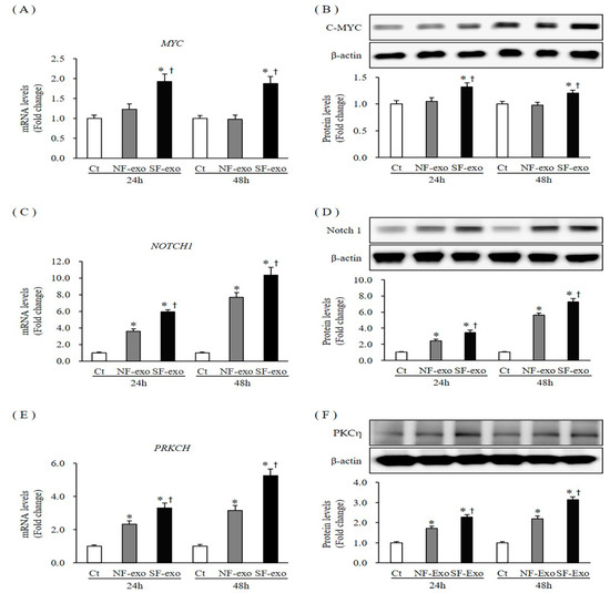 The expression of p21 and p27 is tightly regulated by several factors, such as C-MYC, Notch1, and PKCη [30,31,32]. The C-MYC (MYC) mRNA and protein levels remained unchanged at 24 h and 48 h after treatment with 100 μg/mL NF-exosomes, compared with DPBS-treated control cells (mRNA expression was 1.13- and 0.98- fold at 24 and 48 h, protein levels were 1.04- and 0.97-fold and 24 and 48 h, respectively). However, MYC mRNA and protein levels significantly increased at 24 h and 48 h after treatment with 100 μg/mL HTSF-exosomes, compared with DPBS-treated control cells and NF-exosome treated cells (mRNA expression was 1.93- and 1.88- fold at 24 and 48 h and protein levels were 1.32- and 1.23-fold and 24 and 48 h, respectively, p < 0.05) (Figure 7A,B; Figure S7). Compared with NF-exosomes, mRNA and protein expression of MYC more significantly increased with HTSF-exosome treatment at 24 and 48 h (Figure 7A,B; Figure S7). The mRNA and protein level expression of Notch1 (NOTCH1) increased significantly at 24 and 48 h after treatment with 100 μg/mL NF- or HTSF-exosomes, respectively, compared with DPBS treatment (mRNA expression was 3.6- and 5.9-fold at 24 h and 7.69- and 10.32-fold at 48 h, respectively; protein levels were 2.39- and 3.45-fold at 24 h and 5.6- and 7.25-fold at 48 h, respectively; p < 0.05) (Figure 7C,D; Figure S7). Furthermore, compared with NF-exosomes, mRNA and protein level expression of NOTCH1 was more significantly increased by HTSF-exosome treatment at 24 and 48 h (p < 0.05) (Figure 7C,D; Figure S7). The mRNA and protein expression of PKCη (PRKCH) increased consistently from 24 to 48 h after treatment with 100 μg/mL NF- and HTSF-exosomes compared with control, respectively (mRNA expression was 2.33- and 3.31-fold at 24 h and 3.16- and 5.26-fold at 48 h, respectively; protein levels were 1.7- and 2.16-fold at 24 h and 2.19- and 3.12-fold at 48 h, respectively; p < 0.05) (Figure 7E,F; Figure S7). Compared with NF-exosomes, mRNA and protein expression of PRKCH more significantly increased with HTSF-exosome treatment at 24 and 48 h (Figure 7E,F; Figure S7). These results suggest that NF-exosome treatment and, especially, HTSF-exosome treatment upregulated the expression of C-MYC, Notch1, and PKCη in NHKs.