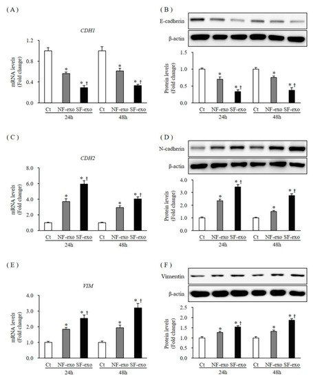 Expression of EMT markers in NHKs after NF- and HTSF-exosome treatment. The mRNA and protein expression of E-cadherin (A,B) in NHKs decreased significantly at 24 and 48 h after treatment with 100 μg/mL NF-exosome, compared with that in the control cells. They further decreased with HTSF-exosome treatment compared with NF-exosome treatment at 24 and 48 h (A,B). The mRNA and protein expression of N-cadherin (C,D) and vimentin (E,F) increased significantly at 24 and 48 h after treatment with 100 μg/mL NF-exosomes, compared with that in the control cells. They were further increased with HTSF-exosome treatment compared with NF-exosomes at 24 and 48 h (C–F). * p < 0.05 for NF- or HTSF-exosome-treated cells versus the corresponding matched control cells. † p < 0.05 for HTSF-exosome-treated cells versus NF-exosome-treated cells. Data represent the mean ± SD; n = 4. EMT, epithelial–mesenchymal transition; Ct, DPBS-treated control cells; NHK, normal human keratinocytes; NF, normal tissue-derived fibroblasts; HTSF, hypertrophic scar tissue-derived fibroblasts.