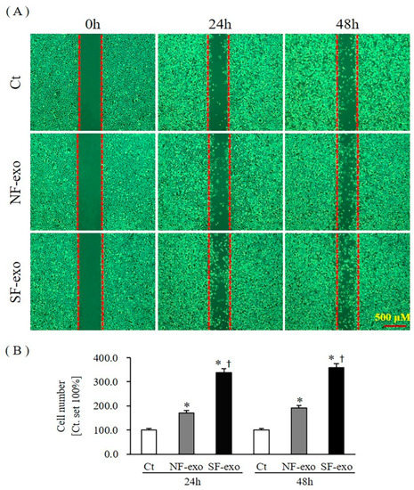 E-cadherin, N-cadherin, vimentin, and cell migration are well-known EMT markers [33]. The mRNA and protein levels of E-cadherin (CDH1) decreased significantly at 24 and 48 h after 100 μg/mL NF-exosome treatment, compared with DPBS treatment, respectively (mRNA levels were 0.56- and 0.61-fold and protein levels were 0.70- and 0.75- fold at 24 and 48 h, respectively; p < 0.05) (Figure 8A,B; Figure S8). Moreover, the mRNA and protein levels of CDH1 further decreased with 100 μg/mL HTSF-exosome treatment at 24 and 48 h, respectively (mRNA levels were 0.29- and 0.33-fold and protein levels were 0.33- and 0.37- fold at 24 and 48 h, respectively; p < 0.05) (Figure 8A,B; Figure S8). The mRNA and protein levels of N-cadherin (CDH2) increased significantly at 24 and 48 h after 100 μg/mL NF-exosome treatment, compared with DPBS treatment, respectively (mRNA levels were 3.71- and 2.93-fold and protein levels were 2.32- and 1.53- fold at 24 and 48 h, respectively, p < 0.05) (Figure 8C,D; Figure S8). Moreover, the mRNA and protein levels of CDH2 further increased with 100 μg/mL HTSF-exosome treatment at 24 and 48 h, respectively (mRNA levels were 5.91- and 4.13-fold and protein levels were 3.42- and 2.83- fold at 24 and 48 h, respectively; p < 0.05) (Figure 8C,D; Figure S8). The mRNA and protein expression of vimentin (VIM) increased significantly at 24 and 48 h after 100 μg/mL NF-exosome treatment, compared with DPBS treatment, respectively (mRNA levels were 1.83- and 1.93-fold and protein levels were 1.25- and 1.31- fold at 24 and 48 h, respectively, p < 0.05) (Figure 8E,F; Figure S8). Moreover, the mRNA and protein expression of VIM further increased with 100 μg/mL HTSF-exosome treatment at 24 and 48 h, respectively (mRNA levels were 2.53- and 3.21-fold and protein levels were 1.54- and 1.91- fold at 24 and 48 h, respectively; p < 0.05) (Figure 8E,F; Figure S8). Cell migration also increased significantly at 24 and 48 h after 100 μg/mL NF-exosome treatment, compared with DPBS treatment, respectively (an increase of 170.3% and 191.6% at 24 h and 48 h, respectively; p < 0.05) (Figure 9A,B). Moreover, migration of NHKs further increased with 100 μg/mL HTSF-exosome treatment at 24 and 48 h, respectively (an increase of 338.6% and 358.7% at 24 and 48 h, respectively; p < 0.05) (Figure 9A,B). These results suggest that HTSF-exosome treatment strongly induced EMT, compared with NF-exosomes in NHKs.