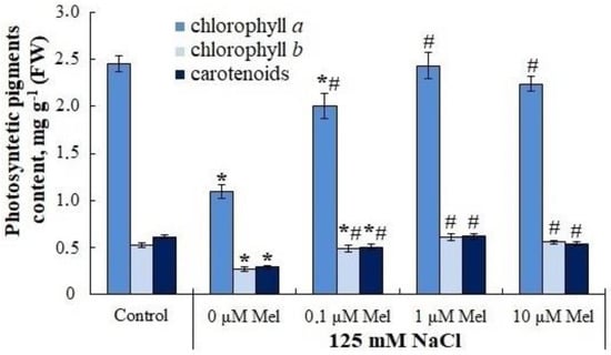 Influence of melatonin and chloride salinity on photosynthetic pigments content in Solanum tuberosum leaves. Asterisks (*) indicate significant differences from the control variant and the «#» indicates significant differences from the «125 mM NaCl» variant (p < 0.05).