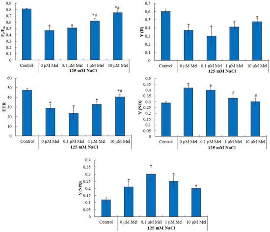 The indicators of photochemical activity of photosystem II of potato plants under salinity are shown in Figure 2 and in Table S2. In control plants, the maximum quantum yield of photosystem II (Fv/Fm) was 0.81 (Figure 2), which corresponds to the Fv/Fm values characteristic of plants not subjected to stress [47]. Salt treatment induced a strong decrease in Fv/Fm down to 0.47, but 1 μM and 10 μM melatonin pretreatment partially alleviated the negative NaCl effect (Figure 2). Similar changes were observed for the effective quantum yield (Y(II)) and electron transport rate (ETR), which decreased by approximately 40% under saline conditions relative to the control, while under treatment with 1 μM melatonin, the Y(II) values and ETR differed from the values of the control variant by only 15% (Figure 2).