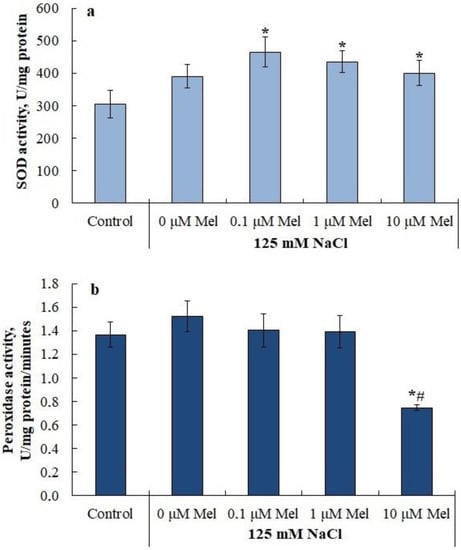Influence of melatonin and chloride salinity on the activity of antioxidant enzymes: (a) Superoxide dismutase (SOD) activity; (b) Peroxidase activity. Asterisks (*) indicate significant differences from the control variant and the «#» indicates significant differences from the «125 mM NaCl» variant (p < 0.05).