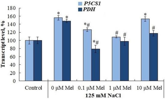 Influence of melatonin and chloride salinity on the level of transcripts of the key genes of biosynthesis (P5CS1) and degradation (PDH) of proline in Solanum tuberosum leaves (% of the control). Asterisks (*) indicate significant differences from the control variant and the «#» indicates significant differences from the «125 mM NaCl» variant (p < 0.05).