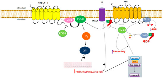 Role of (atrial) cardiomyocyte RGS4 in the context of human AFib. Note that the free Gi/o-protein-derived Gβγ dimer can also activate certain isoforms of PLCβ directly. Also depicted is the inhibitory effect of RGS4 on NLRP3 inflammasome (indirectly, via enhanced PKA-dependent phosphorylation) which awaits experimental confirmation. AngII: angiotensin II; ACh: acetylcholine; IP3: inositol 1′, 4′, 5′-trisphosphate; Pi: inorganic phosphate; ASC: apoptosis-associated speck-like protein containing a caspase recruitment domain (CARD); Pro-Casp-1: pro-caspase-1; HR: heart rate. See text for details and all other molecular acronym descriptions.