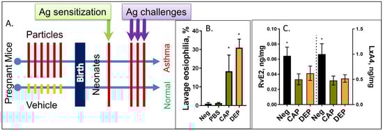 Schematic of the study protocol. (A) Pregnant dams at E14-E20 days of gestation received 6 intranasal instillations of CAP or DEP suspensions, or vehicle. After birth, the pups received a single i.p. sensitization injection with ovalbumin OVA at postnatal day P3 and a set of 3 OVA aerosol challenges at days P12-14, and were then analyzed at P16. Pups born to particle-exposed mothers but not control mothers developed asthma phenotype seen as eosinophilic AI (B) and other asthma-like features (airway hyperresponsiveness, lung tissue infiltration, and cytokine increases (not shown, see [26,27,28,29,30,31])); (n) = 12, and * p < 0.05. (C) Lipidomic profiling of the neonate lungs shows decreased levels of LxA4 and RvE2 in pups of CAP or DEP exposed mothers but not controls (reanalysis from [43]); (n) = 9, and * p < 0.05.