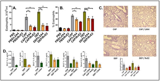 Conclusion. Intra-airway treatment with synthetic LxA4 or RvE2 mitigated the OVA-induced asthma phenotype in the neonates born to mothers exposed to CAPs and DEPs, seen as a reduction in BAL eosinophilia, lung tissue inflammatory infiltration, and proallergic cytokine levels. This suggests that SPM therapies may be able to mitigate hazardous environmental exposure that triggers asthma.