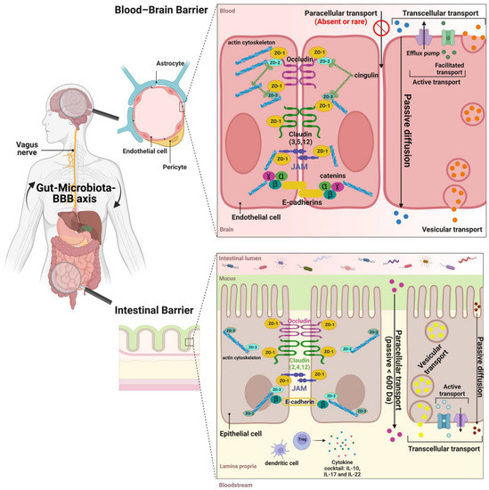 Similarities and differences between the intestinal barrier (IB) and blood–brain barrier (BBB). The IB is made up of epithelial cells separating the gut lumen from the internal space, whereas the BBB is formed by endothelial cells (ECs) lining the blood vessels separating lumen of blood vessels from the central nervous system (CNS) parenchyma. The first defense component of the IB, separating the microbiota from the epithelial cells, is the intestinal mucosa: mucus layer composed of highly glycosylated mucin proteins, defensins, Immunoglobulin A (IgA), and the inner lamina propria where T-regs (regulatory T cells) and resident dendritic cells maintain an anti-inflammatory environment by secreting an appropriate cocktail of cytokines. Each barrier tightly regulates the movement of molecules and ions between the cellular spaces through paracellular (rare in the BBB) and transcellular transports (diffusion, vesicular, and active). The active transport is ensured by efflux pumps and specific transporters. Thus, these two barriers are considered physical, immunological, and dynamic barriers protecting the host against food contaminants and pathogens. The molecular composition of BBB endothelial tight junctions, ensuring paracellular passage restrictions, shows remarkable similarities to those in epithelial cells (but more stringency at the BBB) as they are formed by strands of occludin, claudin molecules, and JAM (junction adhesion molecules) that are linked to the cytoskeleton by zonula occludens (ZO-1, 2, and 3) as well as intracellular proteins (e.g., catenin).