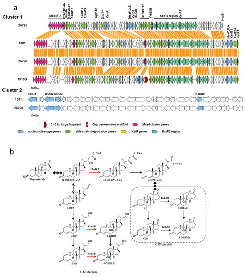 Partial gene cluster encoding the catabolism of sterols in M. neoaurum DSM 1381and putative phytosterol metabolic pathway by M. neoaurum DSM 1381. (a) Genes in the map are color-coded according to assigned or proposed function: Orange, mce cluster genes for steroids transportation; Green, side-chain degradation genes; Blue, nucleus cleavage genes; Light green, the genes under the control of KstR2; Yellow, the gene encoding the transcriptional repressor KstRs; (b) The red arrow indicates the step blocked in M. neoaurum DSM 1381.