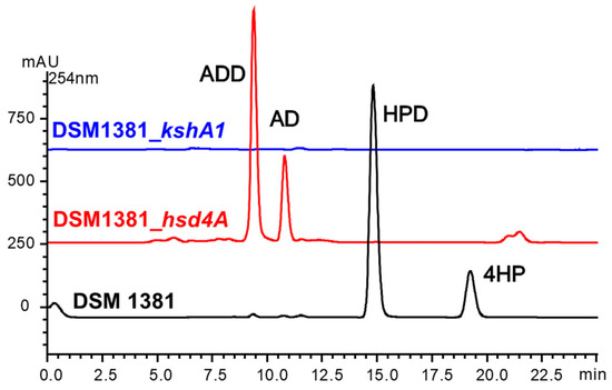 HPLC chromatogram comparison of the products from the transformation of phytosterols by strains DSM 1381_hsd4A (red), DSM 1381_kshA1 (blue), and M. neoaurum DSM 1381 (black).