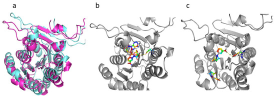 Structural model of Hsd4A. (a) DSM 1381_Hsd4A, aquamarine; ATCC 25790_Hsd4A, light magenta; (b) DSM 1381_Hsd4A, gray, 171E and NAD+ shown in sticks; (c) DSM 1381_Hsd4A, gray, K171 and NAD+ shown in sticks.