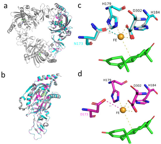 Structure model of KshA1. DSM 1381_ KshA1, pink; DSM 44074_KshA1, blue; structural template, gray; substrate AD, green; the non-heme Fe2+, gold (a,b). The residues within 4 Å of Fe are shown in sticks (c,d).