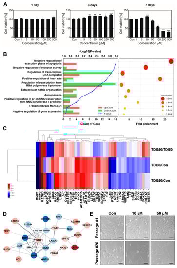 BEAS-2B transcriptional and morphological alteration after TDI treatment. (A) Cell viability was measured for TDI-exposed BEAS-2B cells after 1, 3, and 7 days. (B) After exposure to 50 μM and 250 μM of TDI for 24 h, gene ontology (GO) and gene set enrichment analyses were performed using 251 differentially expressed genes (≥2 folds, ≥5 normalized data values). (C) Hierarchical clustering was performed using a fold change value of 44 DEGs related to cancerous properties. Red-blue colors indicate relative changes in TDI50/Con and TDI250/Con gene expression. Similar expression patterns determined gene distance. (D) For 44 DEGs, a PPI analysis was conducted using the string database. Significantly increased or decreased genes are represented by red and blue nodes, respectively. Connected nodes have a significant co-expression relationship demonstrated by bold lines. (E) BEAS-2B morphological changes during short-term and chronic TDI exposures were observed by microscope. Chronic TDI exposure led to morphological alterations, including cell elongation and shape change. Every experiment was performed over three times. * p < 0.05; ** p < 0.01; *** p < 0.001 compared to the control group; TDI250: 250 μM of TDI; TDI50: 50 μM of TDI; Con: control; Scale bars: 50 µm.