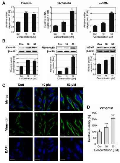 Epithelial-mesenchymal transition (EMT) gene expression increased from chronic TDI exposure. EMT marker (vimentin, fibronectin, and a-SMA) expression levels were confirmed through the chronically TDI-exposed model. (A) Vimentin, fibronectin, and α-SMA gene expression levels were analyzed through qRT-PCR. (B) Vimentin, fibronectin, and α-SMA protein expression levels were measured. (C) Alexa 488 and DAPI labeled the intracellular vimentin and nucleus, respectively. (D) Intracellular vimentin was quantified through Image J software. Every experiment was performed over three times. * p < 0.05; ** p < 0.01; *** p < 0.001 compared to the control group; Con: control; Scale bars: 20 μm.