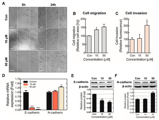 EMT encourages epithelial cell plasticity; therefore, metastasis was measured through cell migration and invasion assays after chronic TDI exposure [,]. Cell migration was notably increased (Figure 3A,B), and cell invasion surged up to 2-fold in the 50 μM exposure group compared to the control (Figure 3C). Additionally, E-cadherin and N-cadherin expressions, which contribute to cell adhesion and motility, were analyzed []. E-cadherin mRNA and protein expression levels waned significantly, whereas N-cadherin expression levels rose (Figure 3D,E). These results suggest chronic TDI exposure induces EMT, thereby increasing cell migration and invasion.