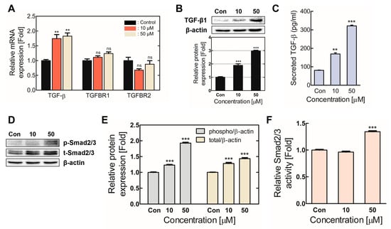 Chronic TDI exposure activated the TGF-β1/SMAD axis. TGF-β1/SMAD signaling factor expression and activity levels were confirmed in the chronically TDI-exposed model. (A) TGF-β1, TGFBR1, and TGFBR2 gene expression levels were evaluated. TGF-β1 (B) protein expression and (C) secretion levels were detected. (D,E) Phosphorylated- and total-SMAD2/3 protein levels were assessed. (F) SMAD2/3 activity was evaluated through phosphorylated-SMAD/total-SMAD quantification. Every experiment was performed over three times. ns: not significance; ** p < 0.01; *** p < 0.001 compared to the control group; Con: control; 10: 10 μM of TDI; 50: 50 μM of TDI.
