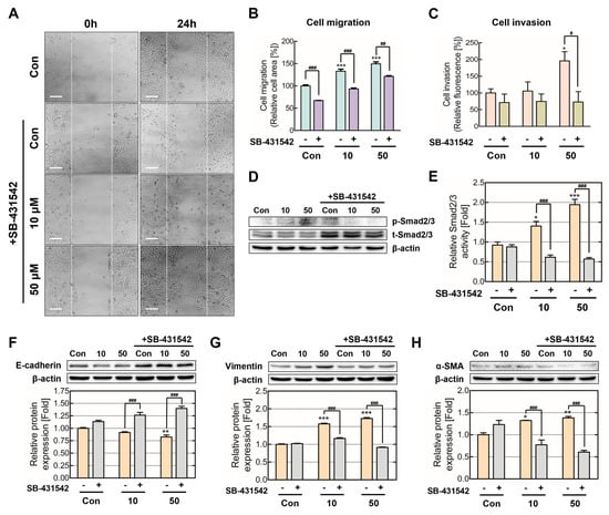 Cell metastasis and EMT attenuation in chronic TDI exposure via TGF-β antagonists. To validate TGF-β1/SMAD axis regulatory effects, the chronic TDI exposure model was co-treated with TDI and the TGFBR-specific antagonist SB-431542. (A) Migration was observed through microscopy after TDI and TGF-β antagonist co-treatment. (B) The bar graph represents quantified values. (C) Cells basement membrane permeability was measured using a fluorescence reader after TDI and TGF-β antagonist co-treatment. (D) p-SMAD2/3 and SMAD2/3 protein expression levels were measured. (E) SMAD2/3 activity was calculated through phosphorylated-SMAD/total-SMAD quantification. (F) E-cadherin, (G) vimentin, and (H) a-SMA protein expression levels were measured. Every experiment was performed over three times. * p < 0.05; ** p < 0.01; *** p < 0.001 compared to the control group; # p < 0.05; ## p < 0.01; ### p < 0.001 compared to SB-431542 untreated group; Con: control; 10: 10 μM of TDI; 50: 50 μM of TDI; Scale bars: 200 µm.